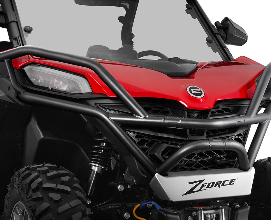 FULL PROTECTION FRONT BUMPER Fits MY23-25 ZFORCE 800/950 Trail, ZFORCE 950 Sport, ZFORCE Sport 4 • Full replacement utilizing stock bumper mounting • Easy mounting with 6 mounting locations • Heavy-duty full protection • Made of 1 1/2" / 38mm powder-coated steel • Works with winch system