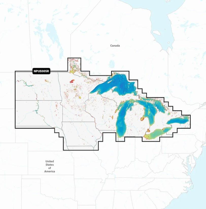 Detailed coverage of the lakes and rivers of Iowa, Michigan, Minnesota, North Dakota, South Dakota, Wisconsin, and the U.S. waters of the Great Lakes that border those states.